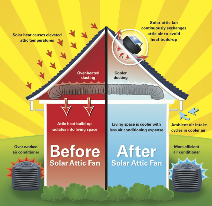 The purpose of a solar fan is to reduce temperatures inside the attic and other enclosed spaces throughout the year. In the summer this helps make the living areas more comfortable and reduces HVAC usage, adding to its lifespan and saving energy. Solar fans also help reduce heat which can cause deterioration of shingles, roof boards, sheathing, siding, insulation and